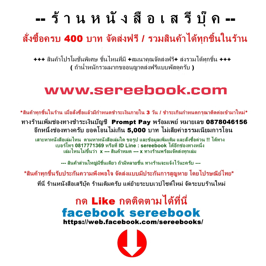 ร้านหนังสือเสรีบุ๊ค จำหน่ายและรับบริการจัดหาหนังสือทุกประเภท,หนังสือเก่า,หนังสือมือสอง,หนังสือสะสม,หนังสือหายาก,หนังสือต้องห้าม,นิตยสารมือสอง,นิตยสารเก่า,แบบเรียนเก่า,ตำราเก่า,การ์ตูนเก่า,การ์ตูนมือสอง,สินค้ามือสอง ของสะสมต่าง ๆ เริ่มเปิดดำเนินการครั้งแรกในโลกออนไลน์เมื่อราวปี 2554 โดยใช้ http://sereebook.mymarket.in.th เป็นเวปไซต์หลัก ปัจจุบันเราได้ย้ายเข้ามาสู่ LnwShop และได้ใช้ http://www.sereebook.com/ เป็นเวปไซต์หลักแทน ส่วนอีเมล เบอร์โทรศัพท์ และทีมงานยังคงเฉกเช่นเดิม สมาชิกและมิตรนักอ่านทุกท่านยังแจ้งหนังสือที่ท่านต้องการมาได้ตามเดิม --- ขอบพระคุณครับ --- ( sereebook@gmail.com ) 081-777-1369 / ID LINE : sereebook 8 มิถุนายน 2560